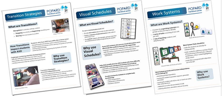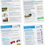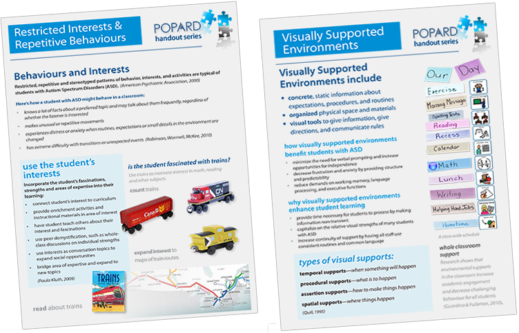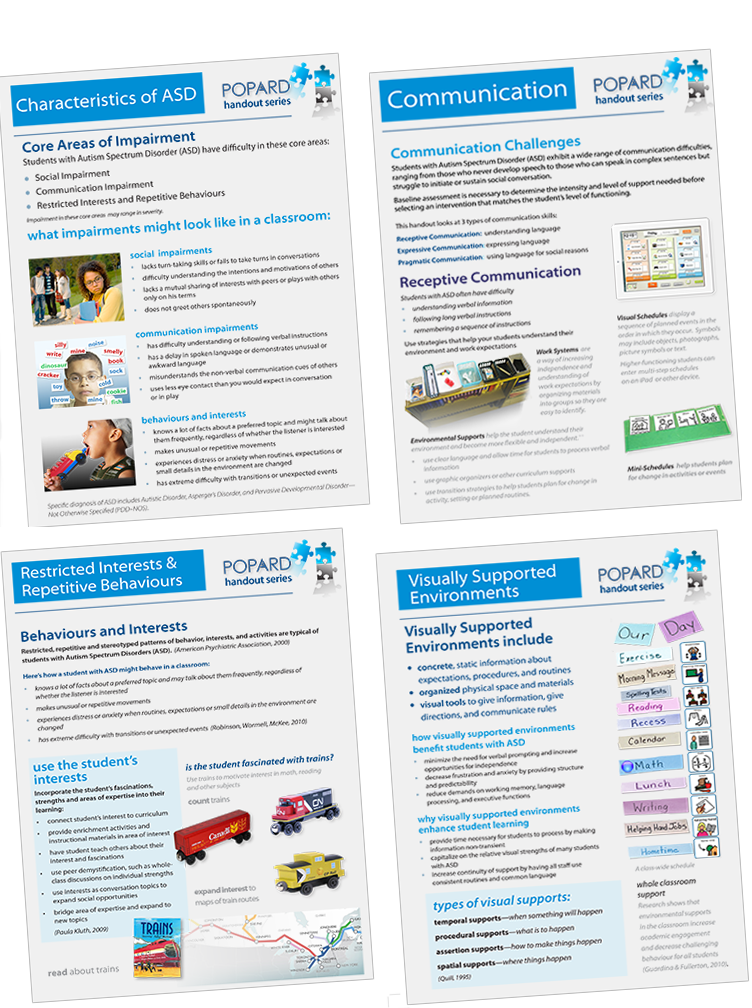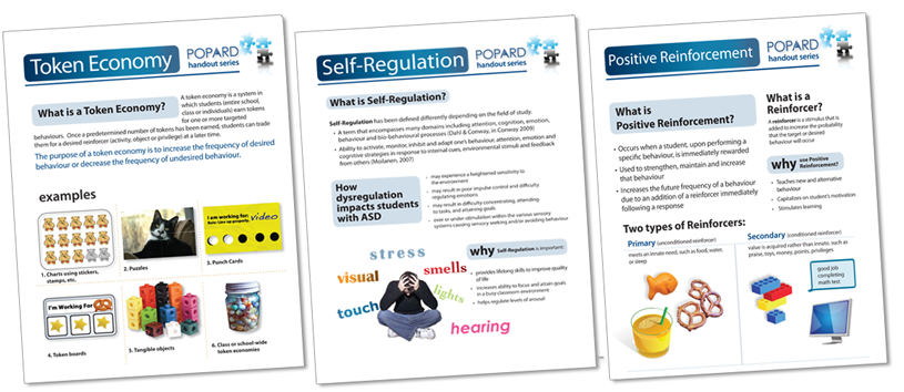 POPARD has researched topics ranging from Executive Functions, Theory of Mind, Positive Reinforcement and more, and has distilled them into illustrated handouts that you can share with teachers, teaching assistants, parents and others on your team.