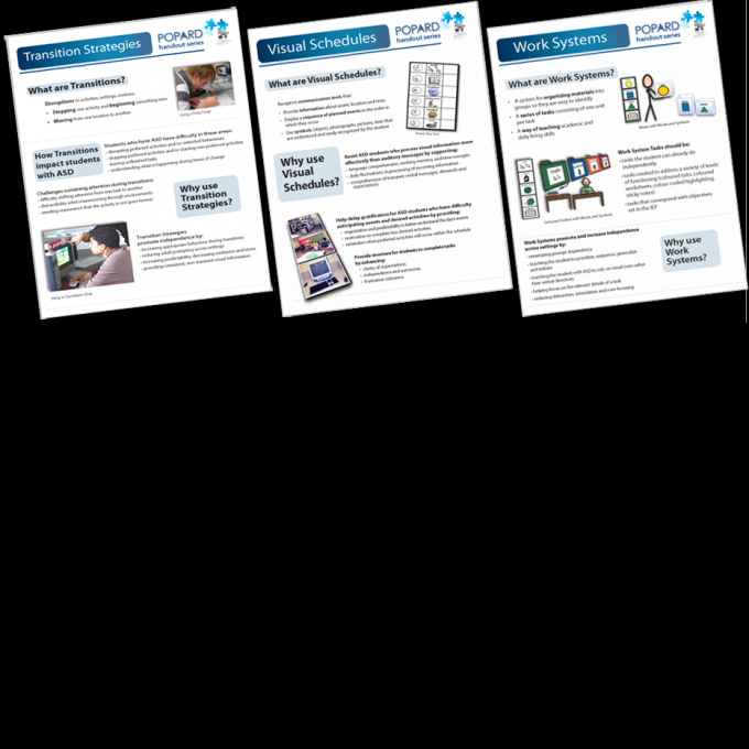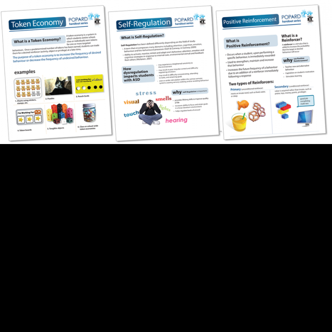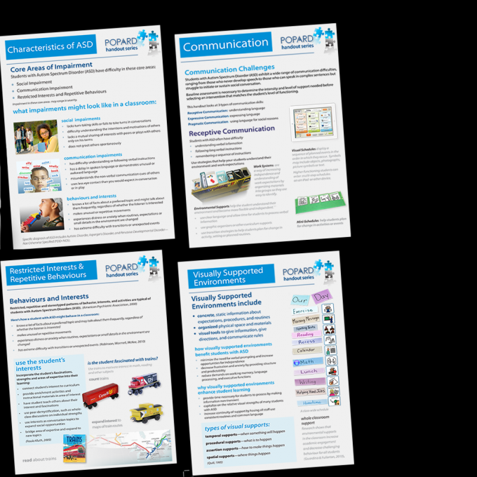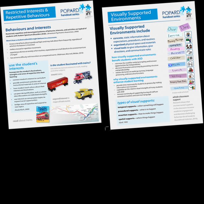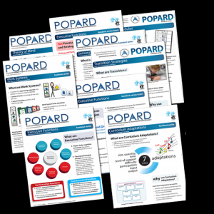 POPARD has researched topics ranging from Executive Functions, Theory of Mind, Positive Reinforcment and more, and has distilled them into illustrated four-page handouts that you can share with teachers, teaching assistants, parents and others on your team.